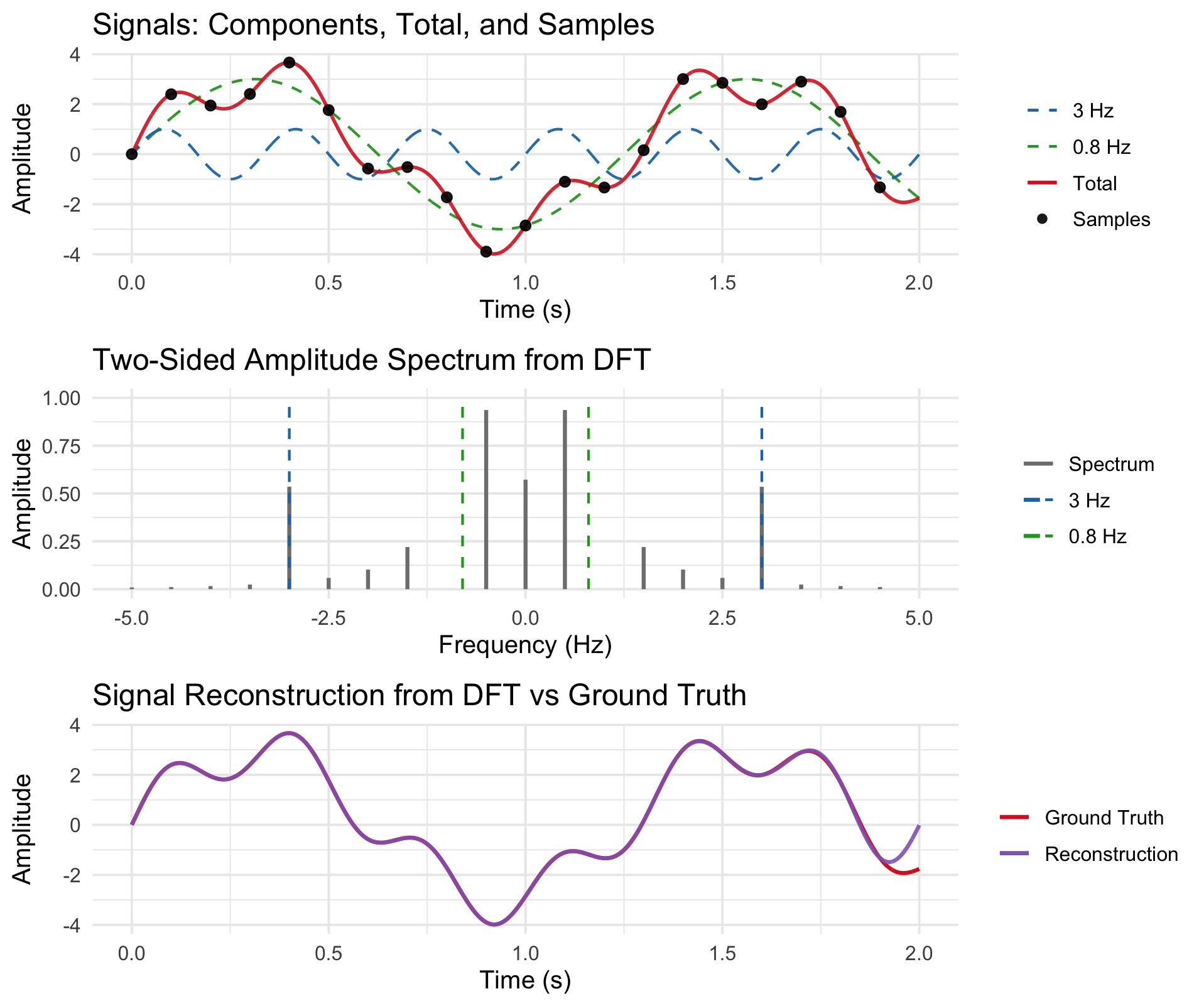 Describes the Fourier transform, mentions the sampling theorem that connects discrete and continuous time Fourier transform, and presents the fast Fourier transform that efficiently applies the discrete Fourier transform to a uniformly sampled sequence.